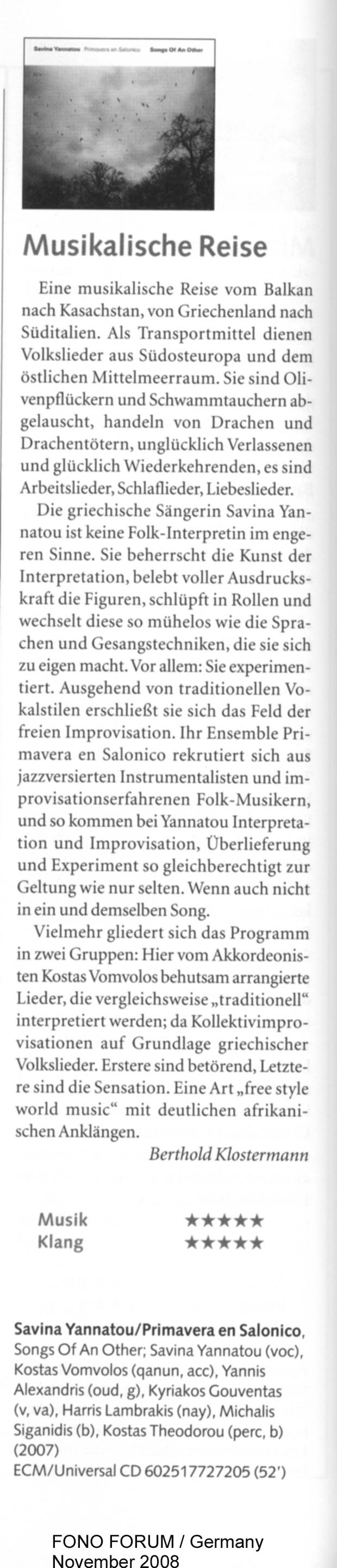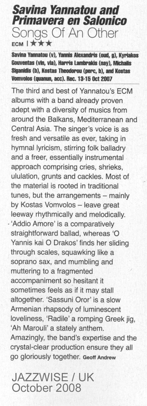 INTRO: "Dark-toned but ambrosial, highly disciplined yet seemingly bursting with a soul of pure flame, the rather staggering Athens-born singer Savina Yannatou is a virtuosic chameleon adept at an extensive range of vocal traditions (and languages) from the Mediterranean region - not just interpreting but leaping off from these old folk musics with a daring, exploratory technique and far-flung tonal scope that allows her to stamp it all with a brash intelligence and some might say punky attitude. There's not a thing dried-up or academic about her new takes on ancient songs. Yannatou really lets the blood out of these songs, brazenly improvising on them, as if called by some inner primal force, kneeding and kneedling them, caressing them, smearing their borders and launching out something entirely new in the process." -John Payne, L.A. Weekly